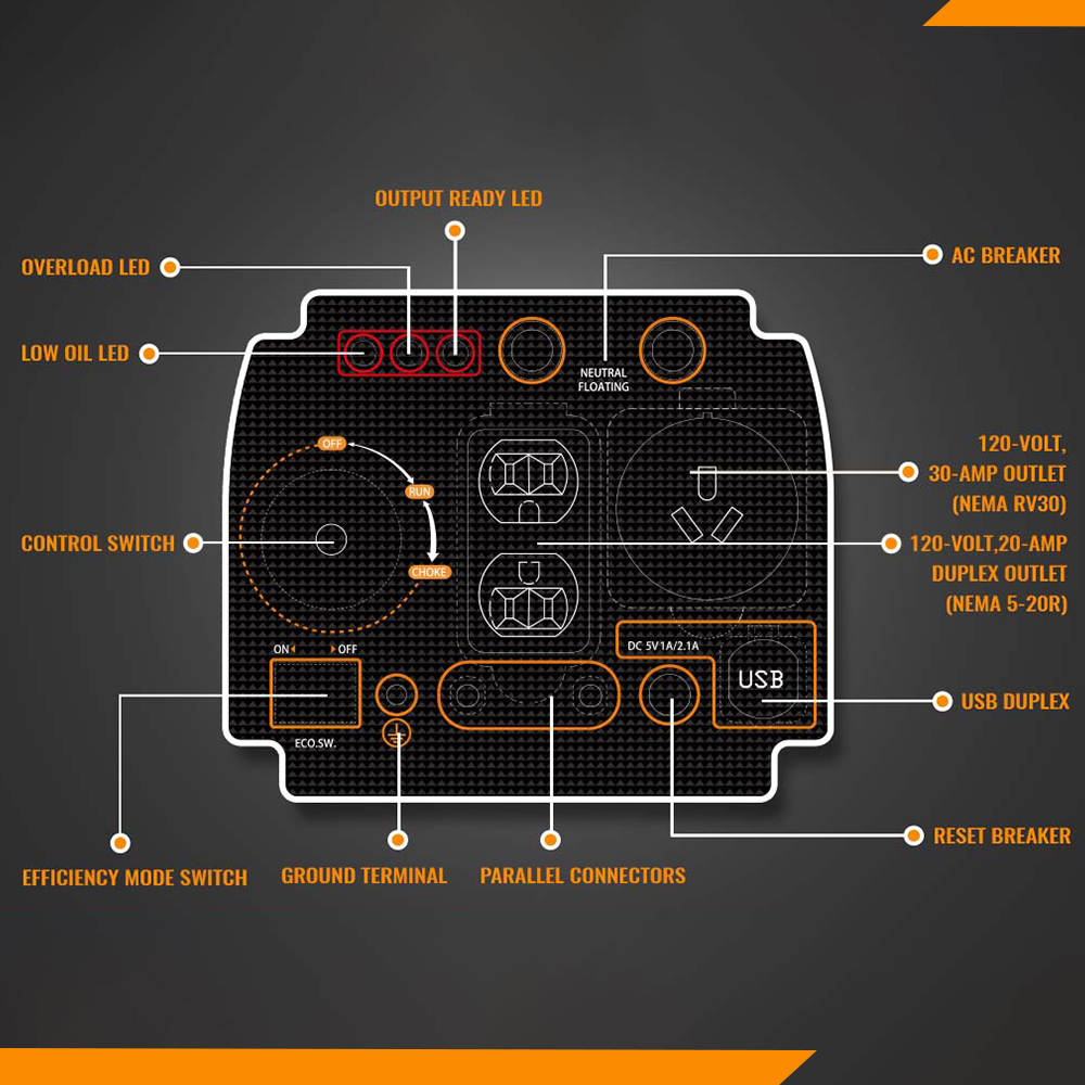 Features: recoil handle for starting, no assembly required, 2 120 volt 20 amp outlets, 1 120 volt 30 amp outlet, 2 USB ports, 5 volt DC that has 1 and 2.1 amp capability, and a 1- year warranty.