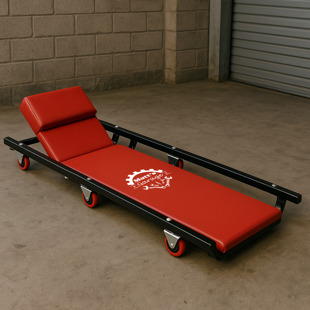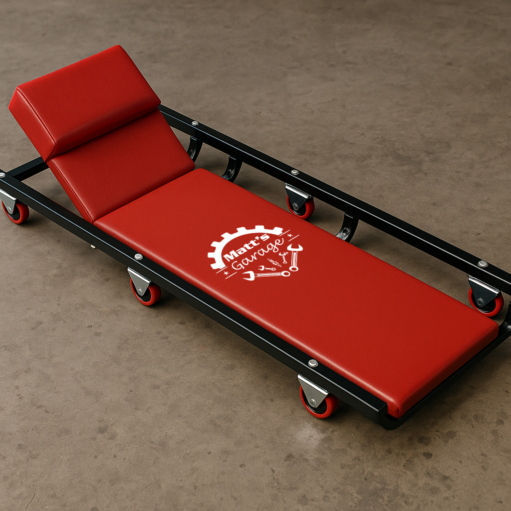 Upgrade your workspace with this personalized red mechanic creeper, customized with a name of your choice. Built for durability and style, this stool is a fantastic gift for the car enthusiast or mechanic in your life.